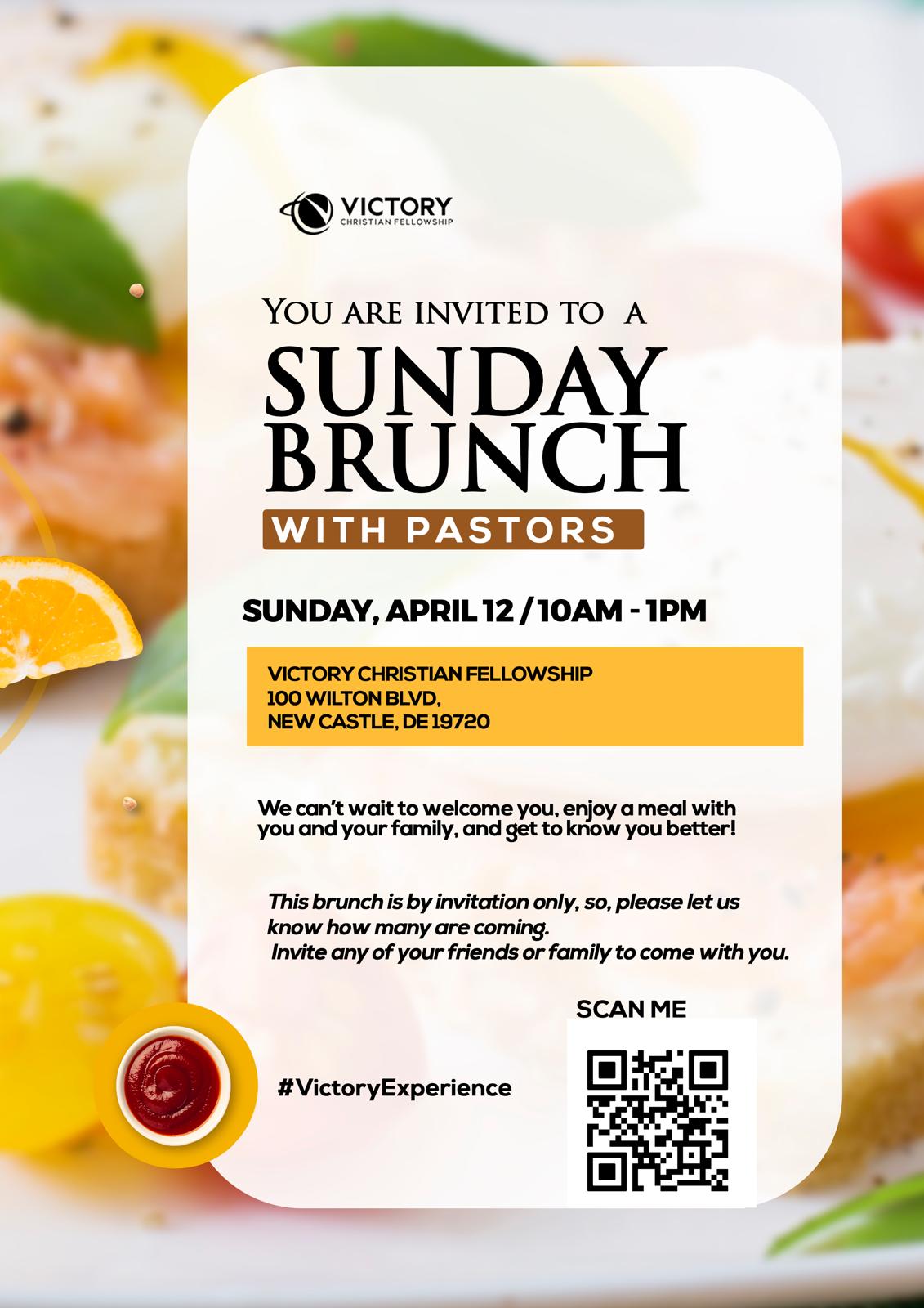 You Are Invited to a Sunday Brunch With Pastors, Sunday, April 12th, 10AM – 1PM You Are Invited to a Sunday Brunch With Pastors Sunday, April 12th, 10AM - 1PM We can't wait to welcome you, enjoy a meal with